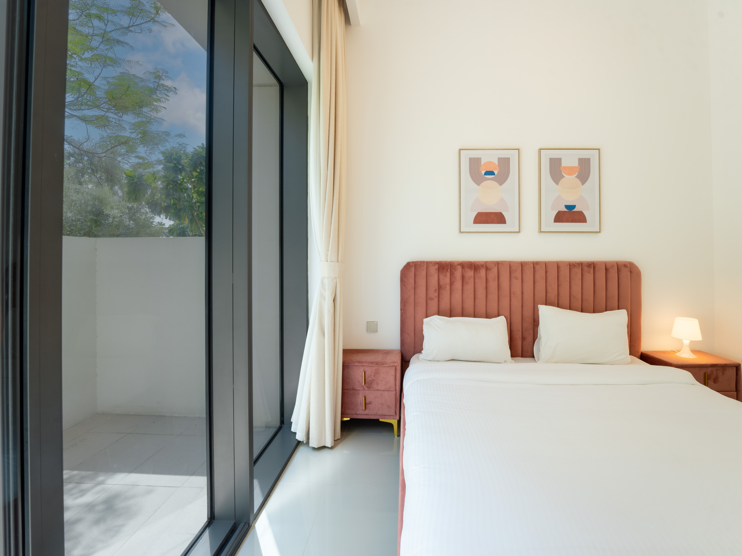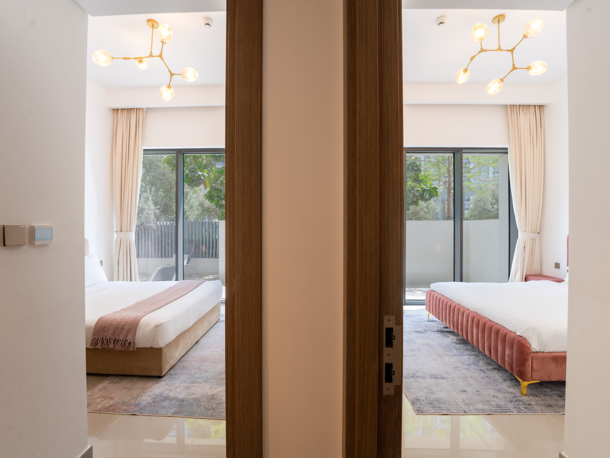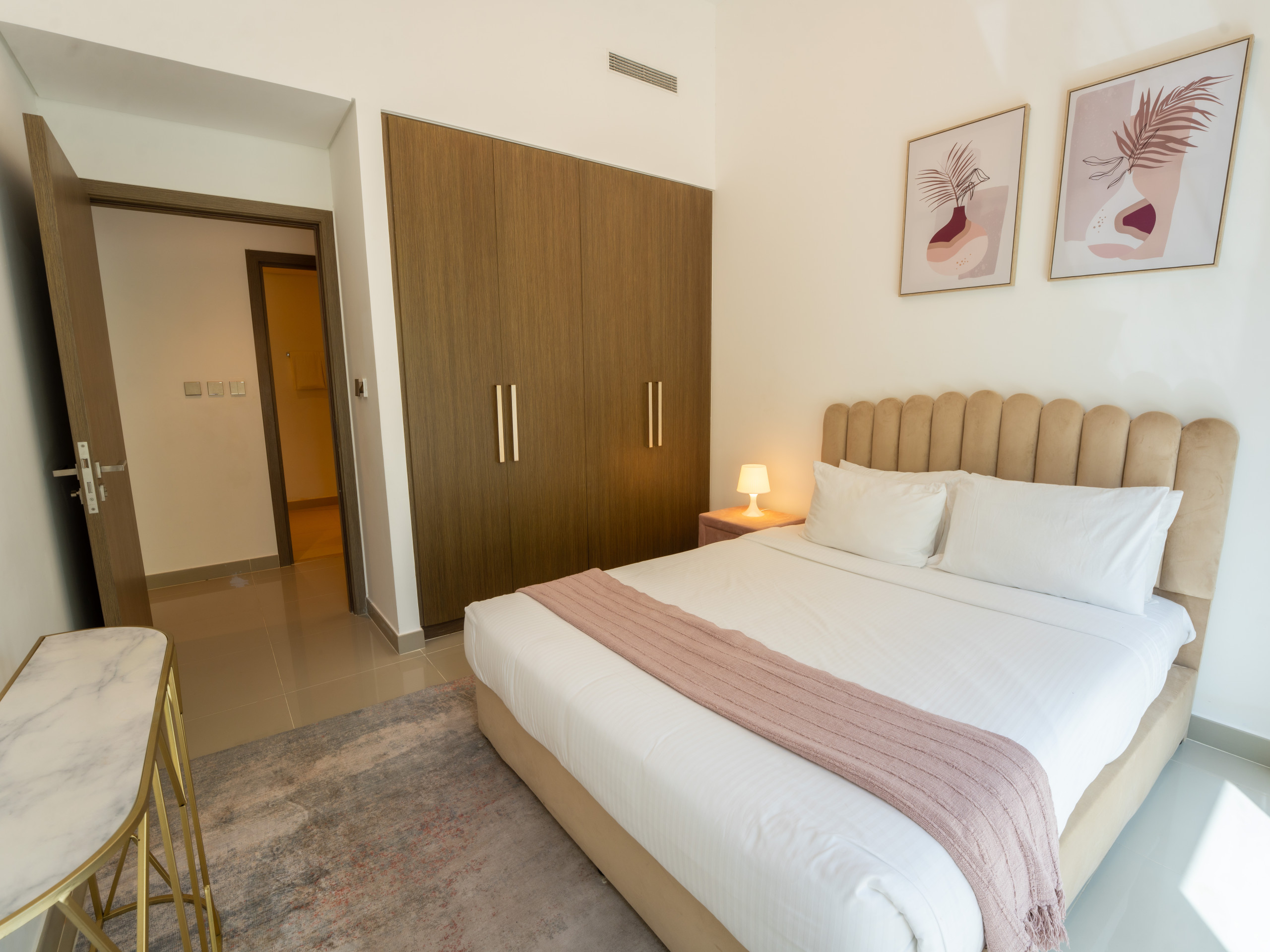 The master bedroom includes a king-size bed, a 55-inch TV, an en-suite bathroom with a standing shower, and direct access to the balcony. The second bedroom also comes with a lavish king-size bed, ensuring comfort and style. Additionally, there is a maid’s room with a single bed, and a corridor bathroom with a standing shower for added convenience.