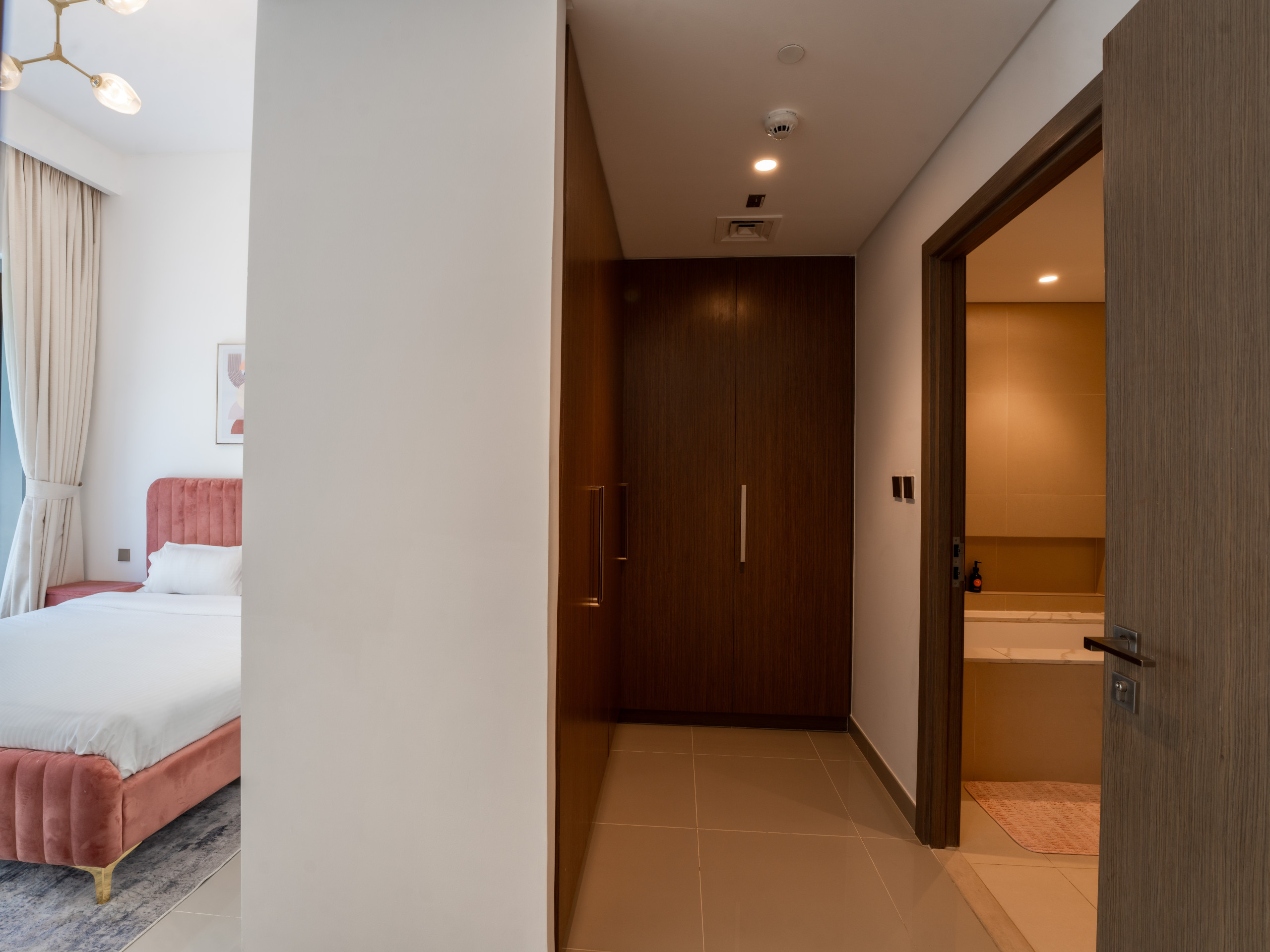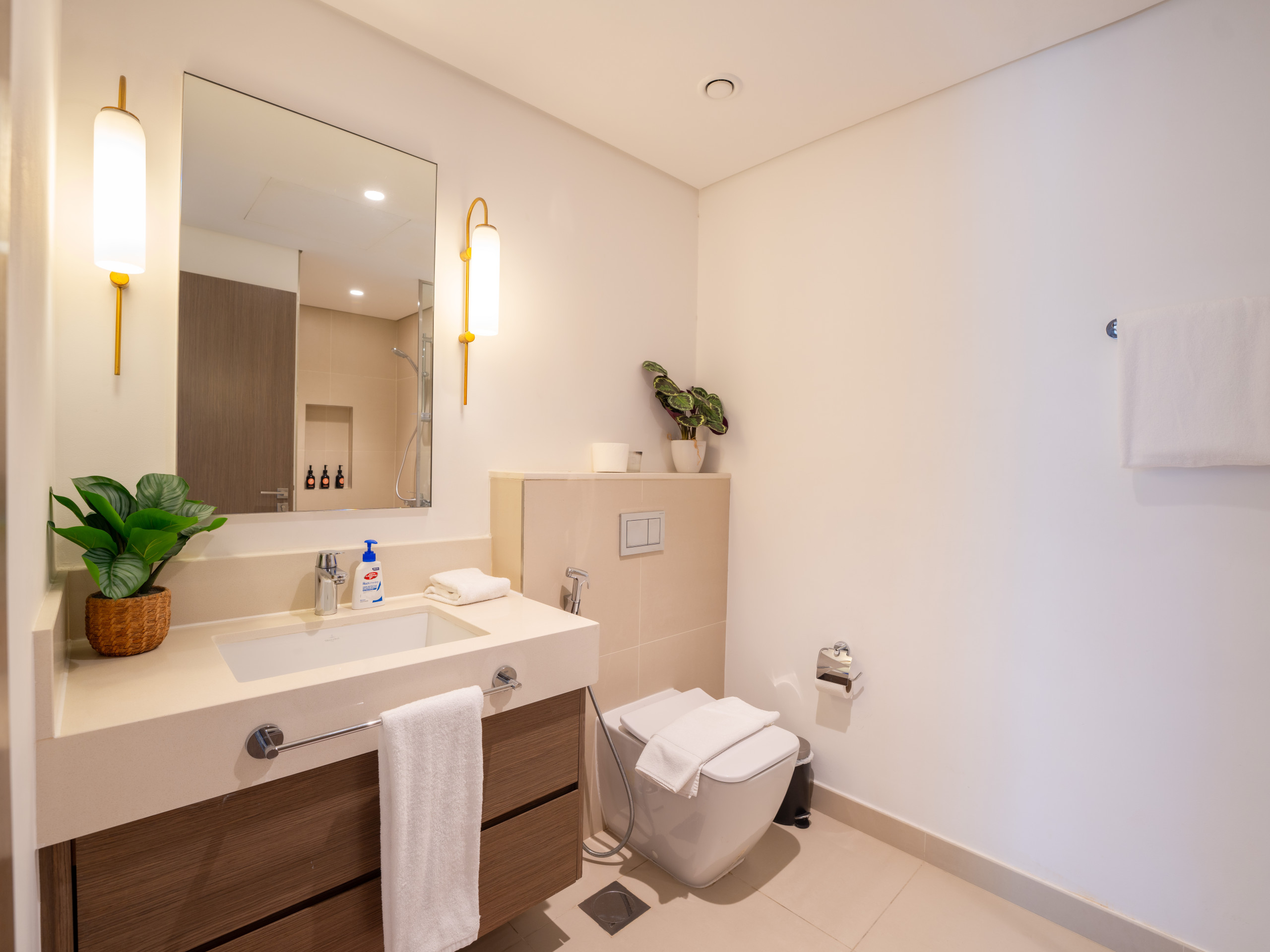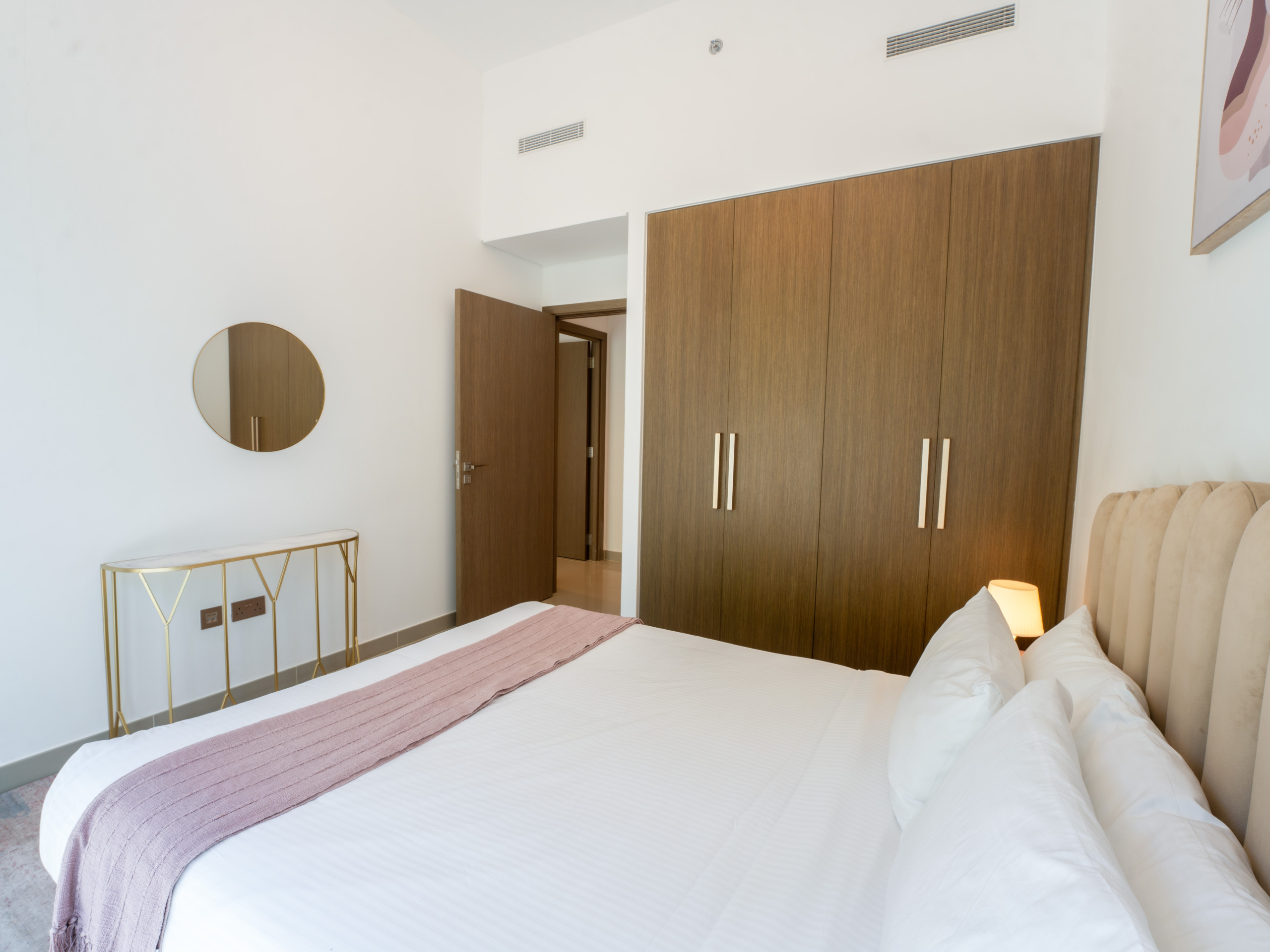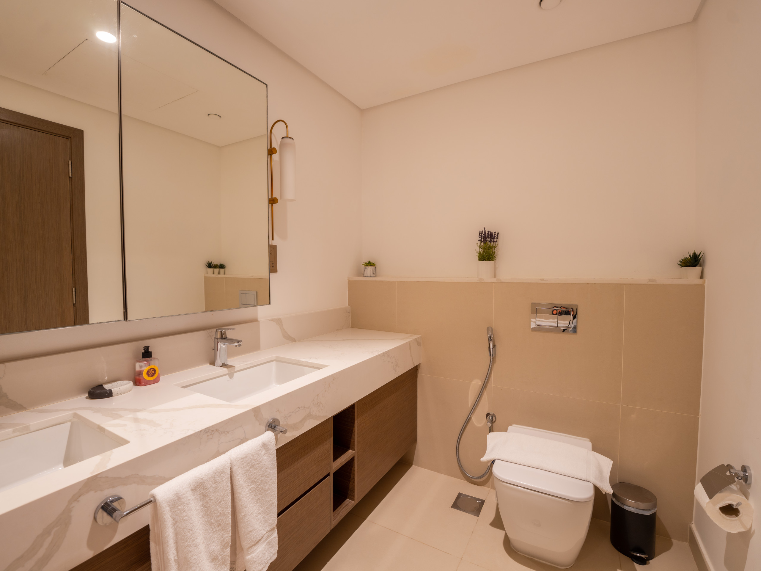 The master bedroom includes a king-size bed, a 55-inch TV, an en-suite bathroom with a standing shower, and direct access to the balcony. The second bedroom also comes with a lavish king-size bed, ensuring comfort and style. Additionally, there is a maid’s room with a single bed, and a corridor bathroom with a standing shower for added convenience.