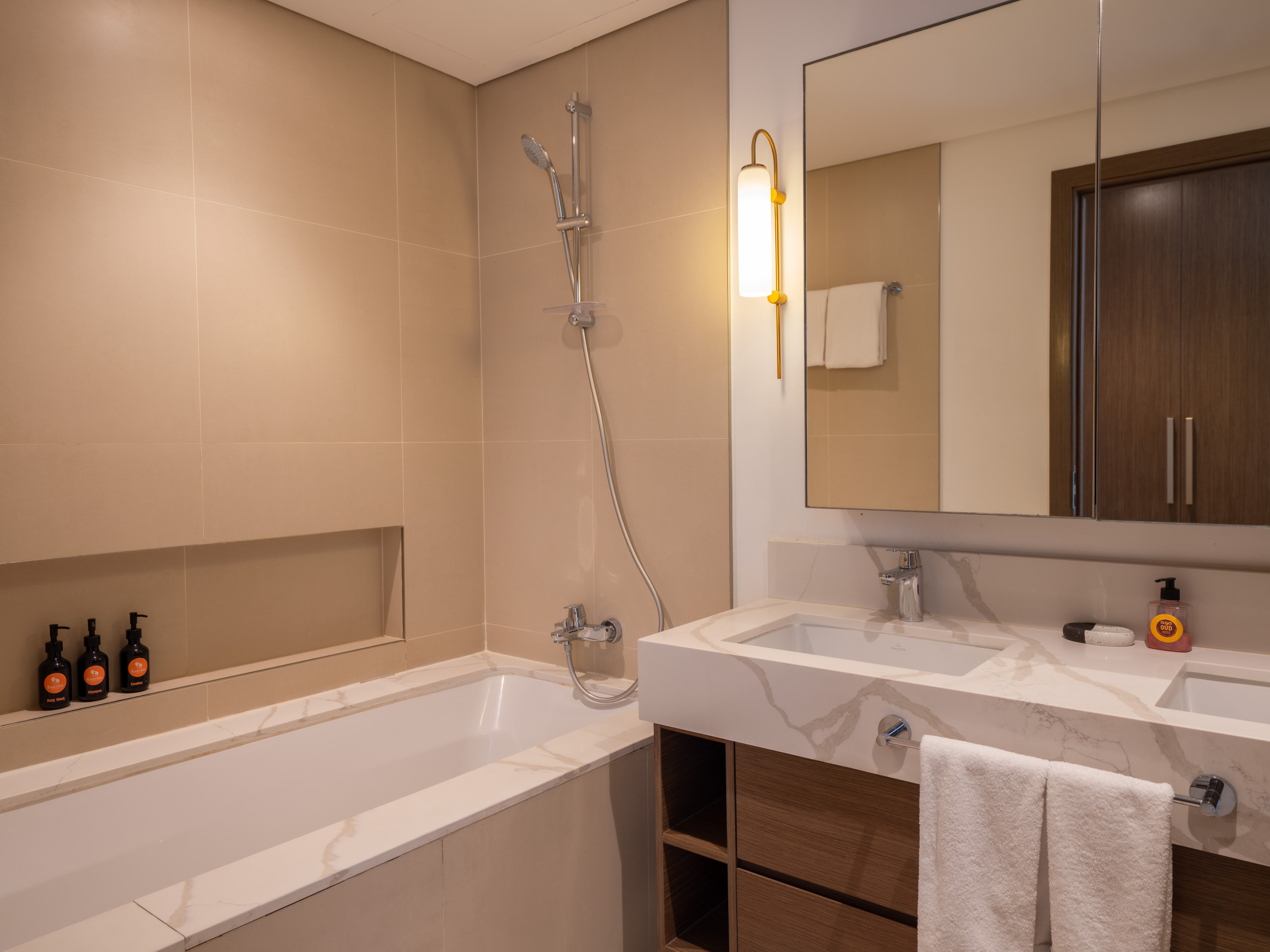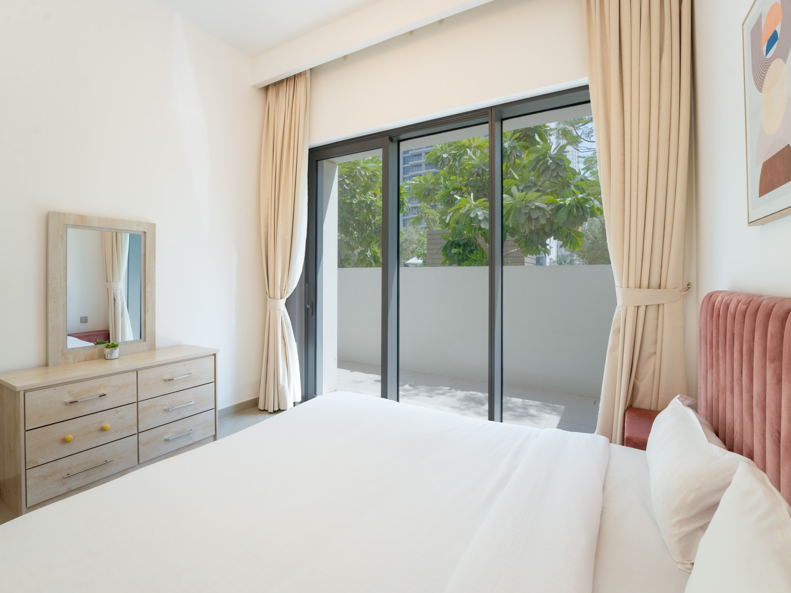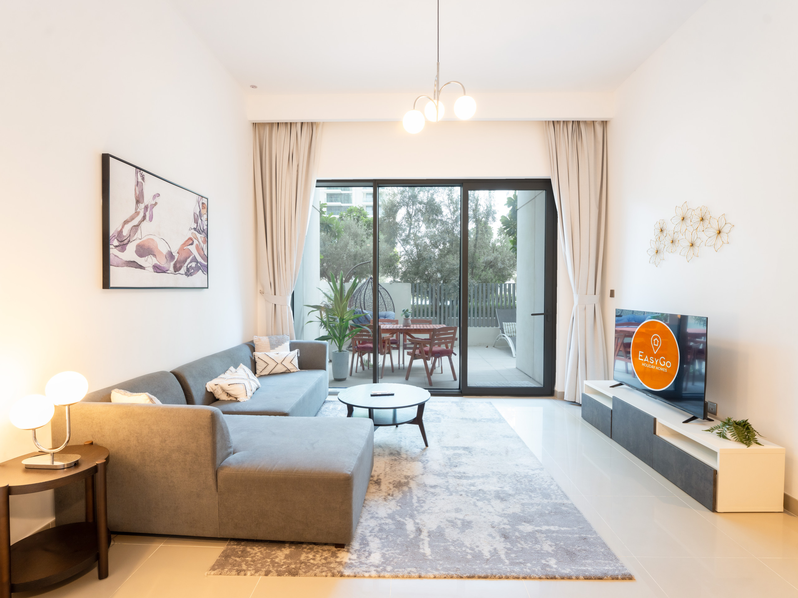 Immerse into classical stay experience filled with comfort and prestige. The property is designed to provide exceptional comfort. The private terrace with Garden were our guests can enjoy outdoor space for their friends and family , with stylish outdoor furniture. relaxing sitting area that can be converted to a sofa bed. one bedroom has king bed and the second bedroom King bed, each bedroom has a private bathroom with bathtub and the other with standup shower. Fully equipped kitchen with dining, cooking ware and essentials. Smart TV with high speed WIFI. The property is ideal for a big family of 4 or a group of friends to experience Dubai creek Harbor vibes