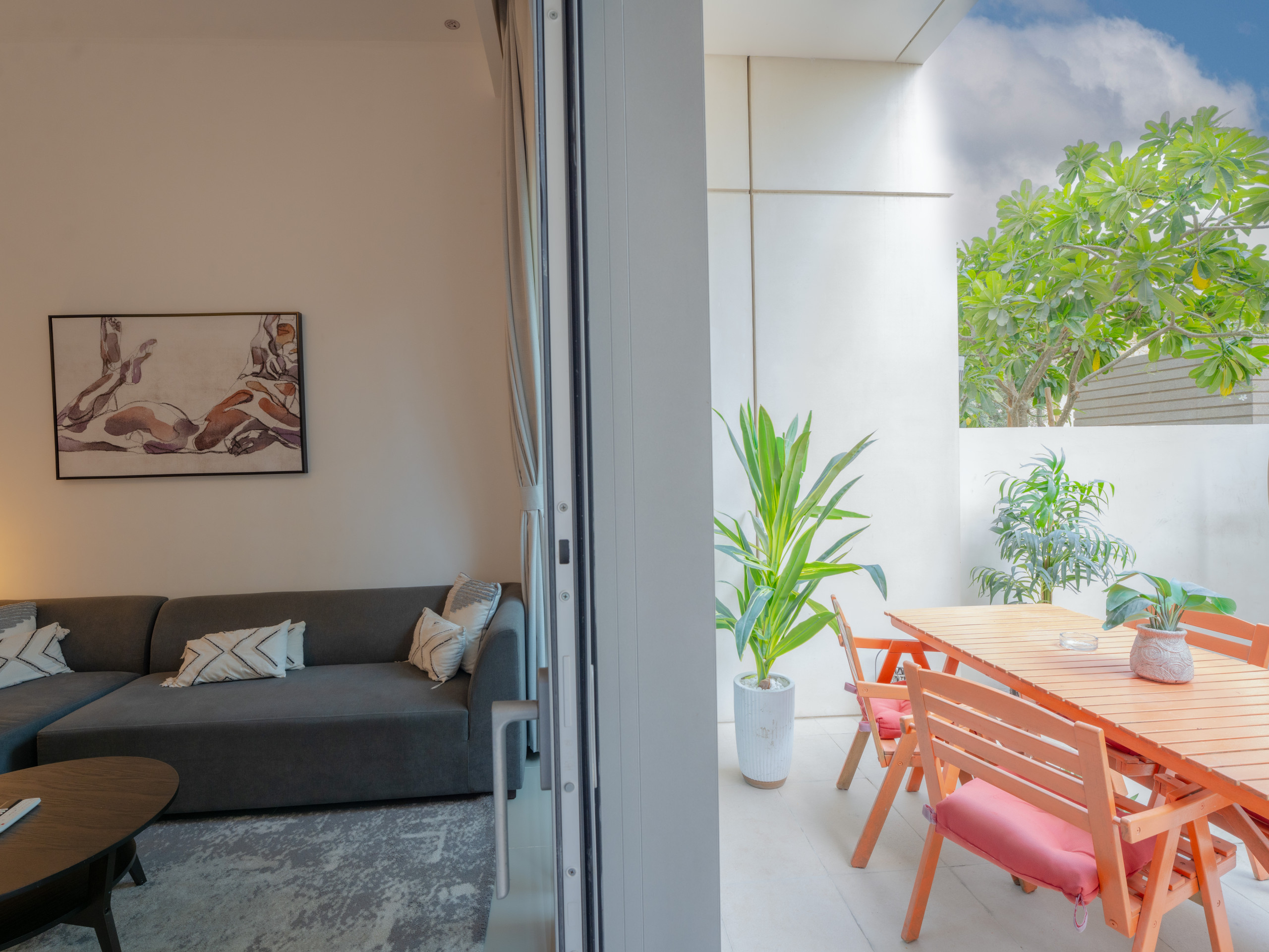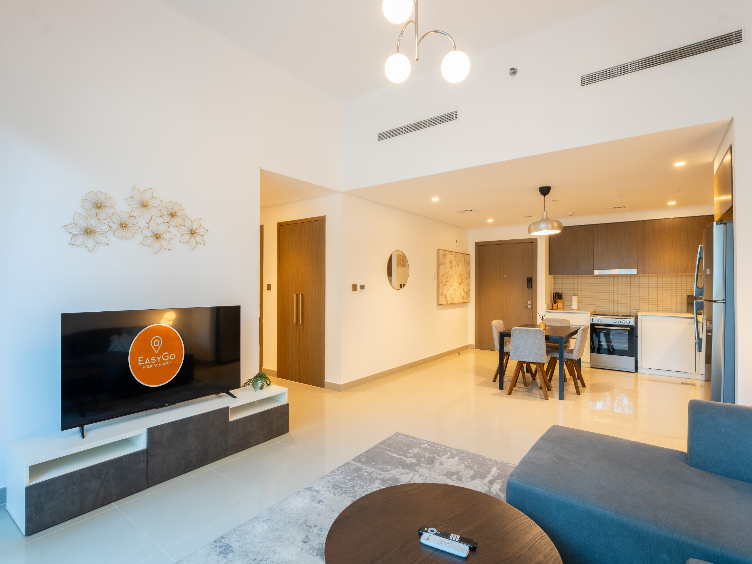 Step into the elegant living area, complete with a comfortable sitting arrangement and a 55-inch Smart TV for your entertainment. An exquisite dining table with fine dining ware adds a touch of sophistication, while the fully equipped open-plan kitchen offers all the essentials for dining and everyday cooking.