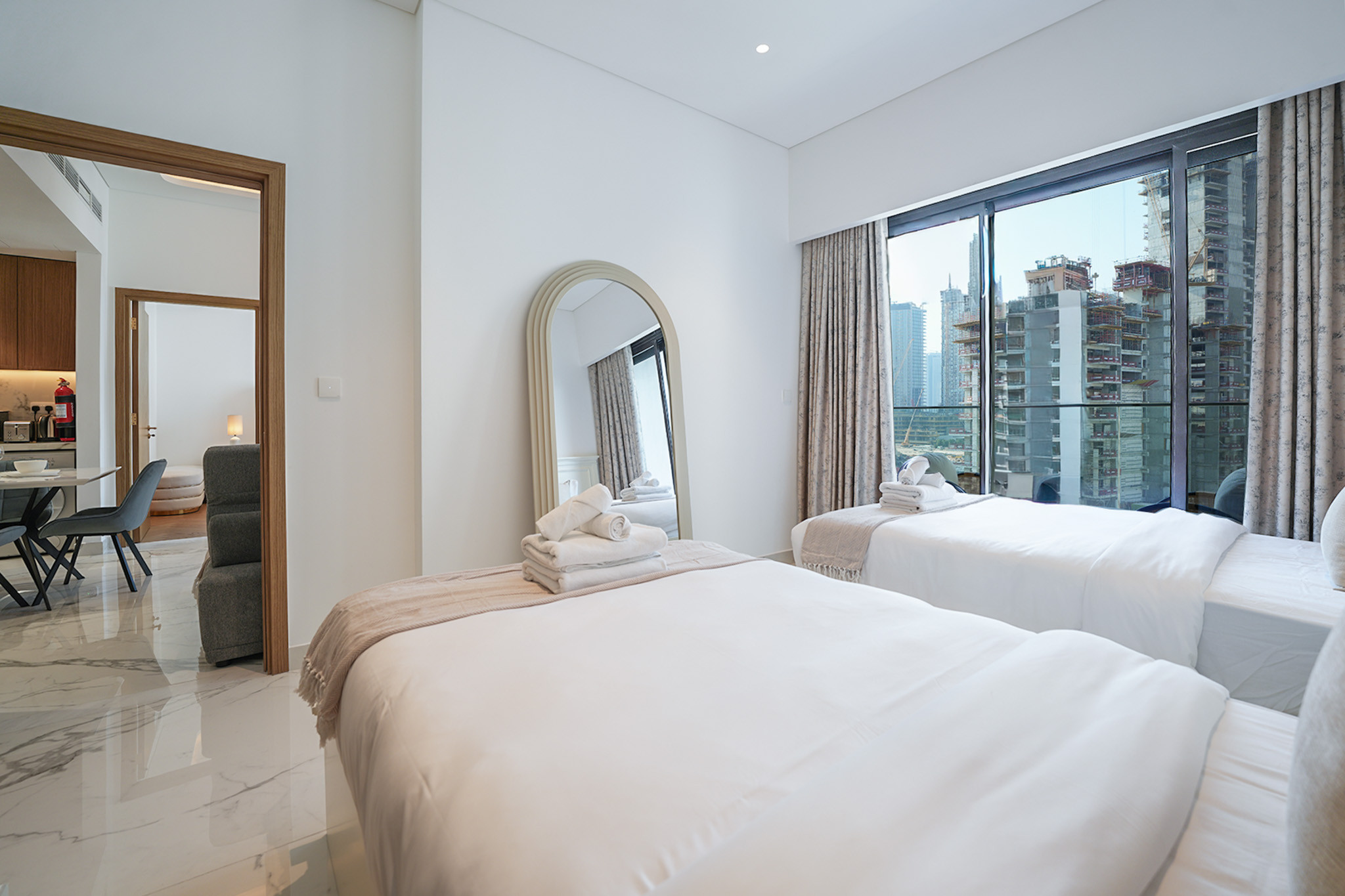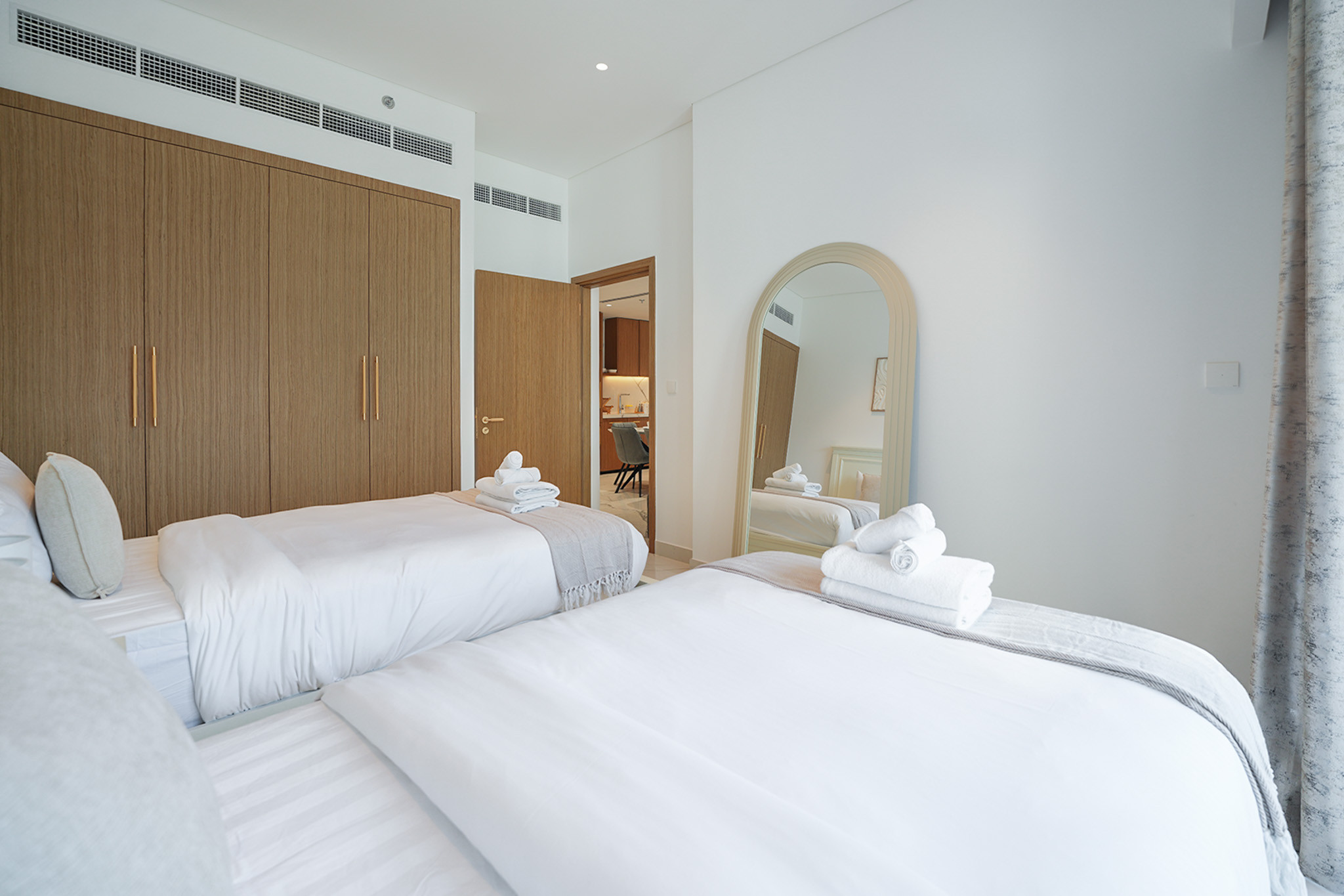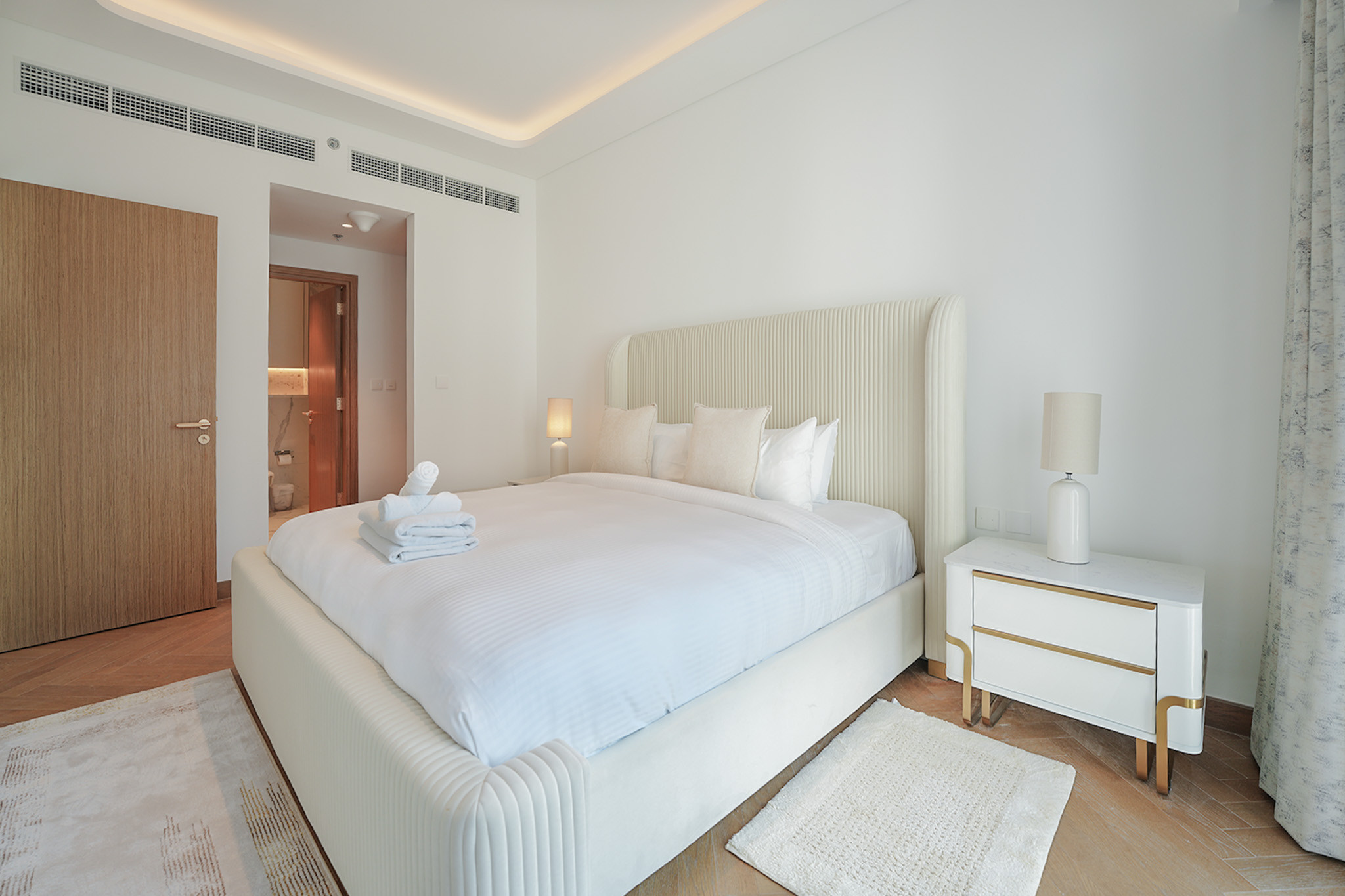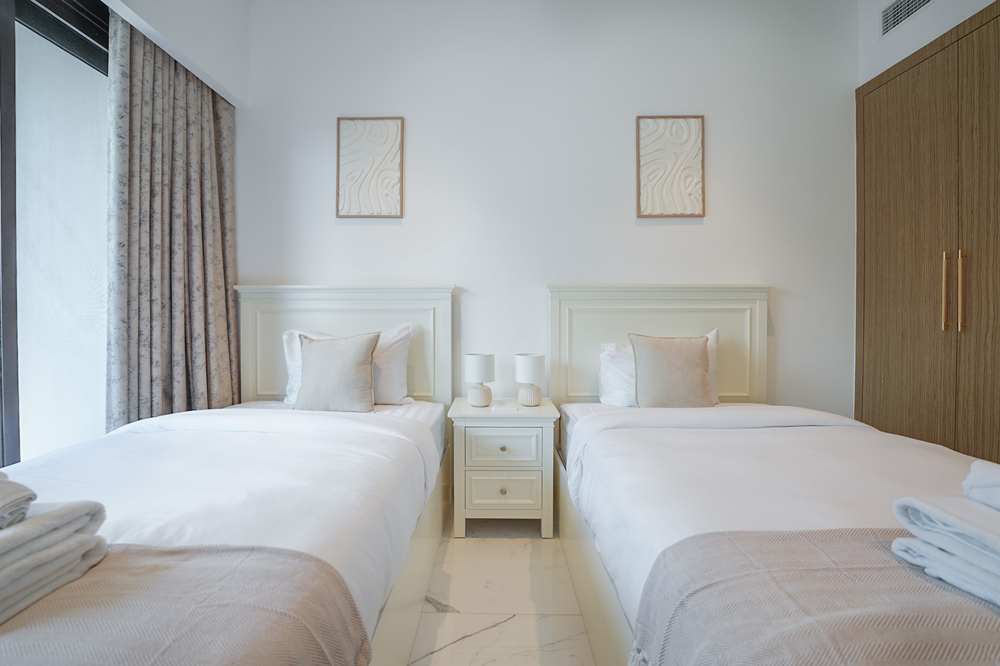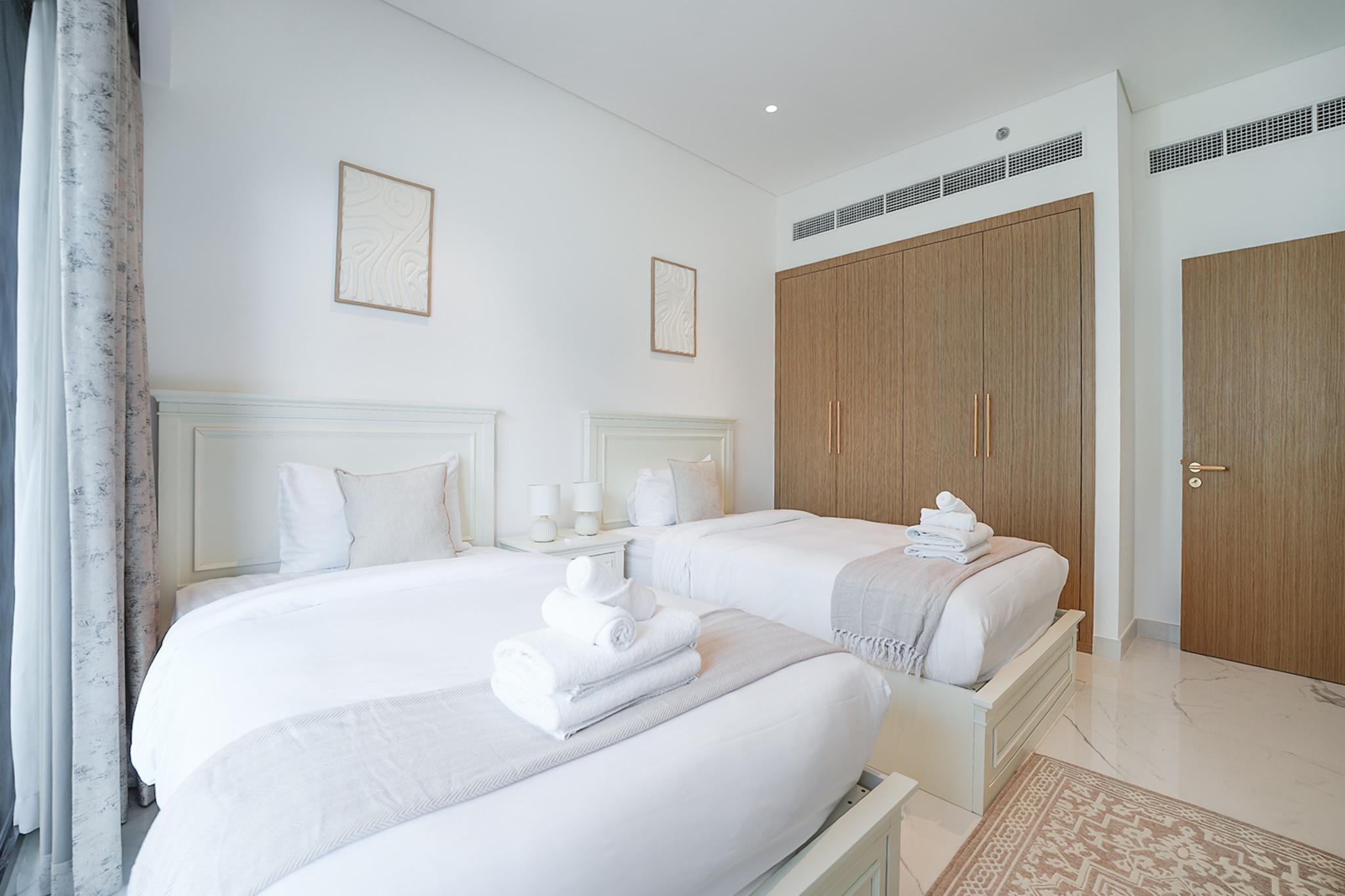 The apartment offers a serene master bedroom with a king-sized bed, en-suite bathroom, and calming décor, complemented by a second bedroom with twin beds and balcony access—ideal for families or groups. Contemporary bathrooms with marble finishes and high-quality fittings complete the home, ensuring both comfort and style throughout your stay.
