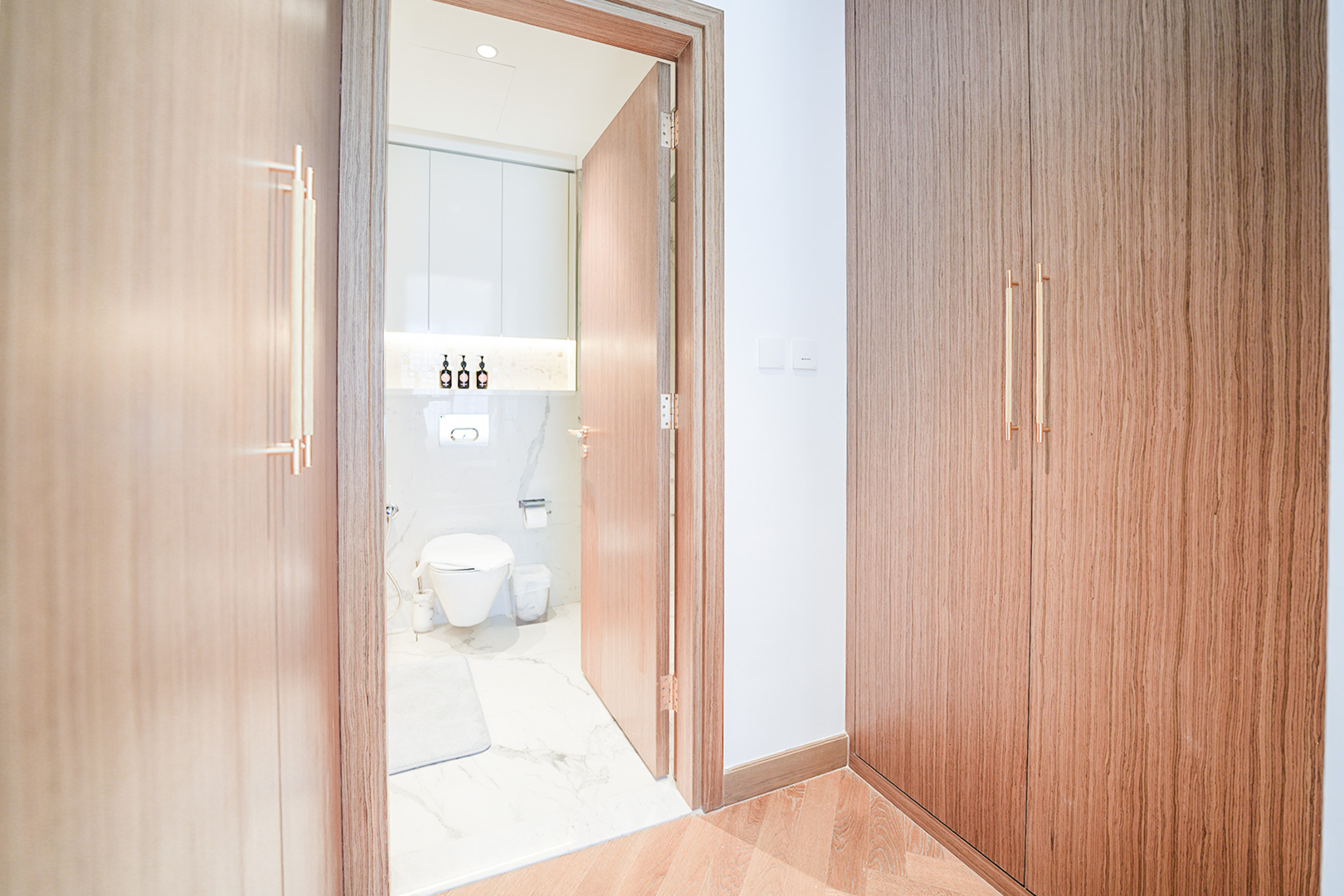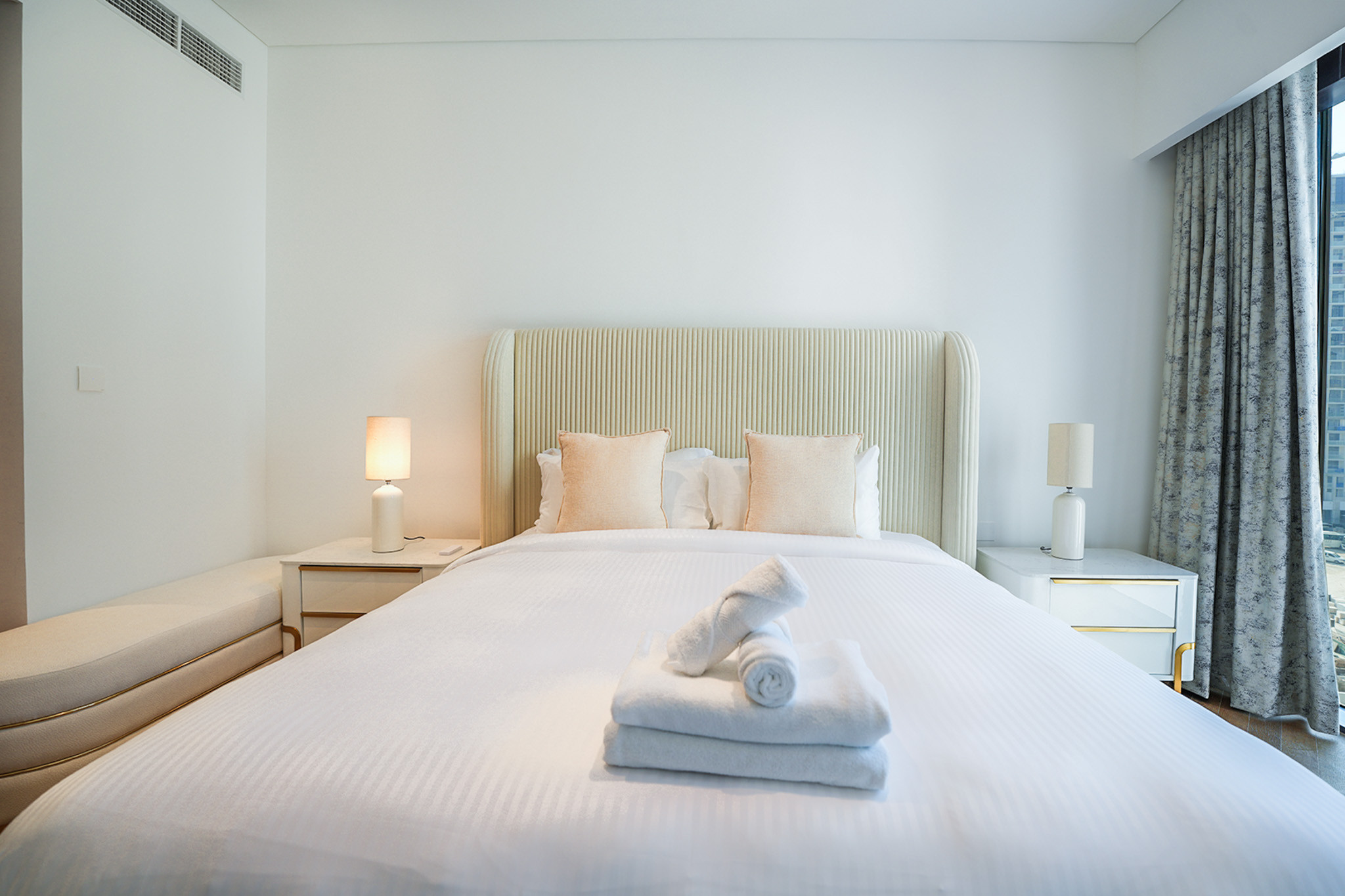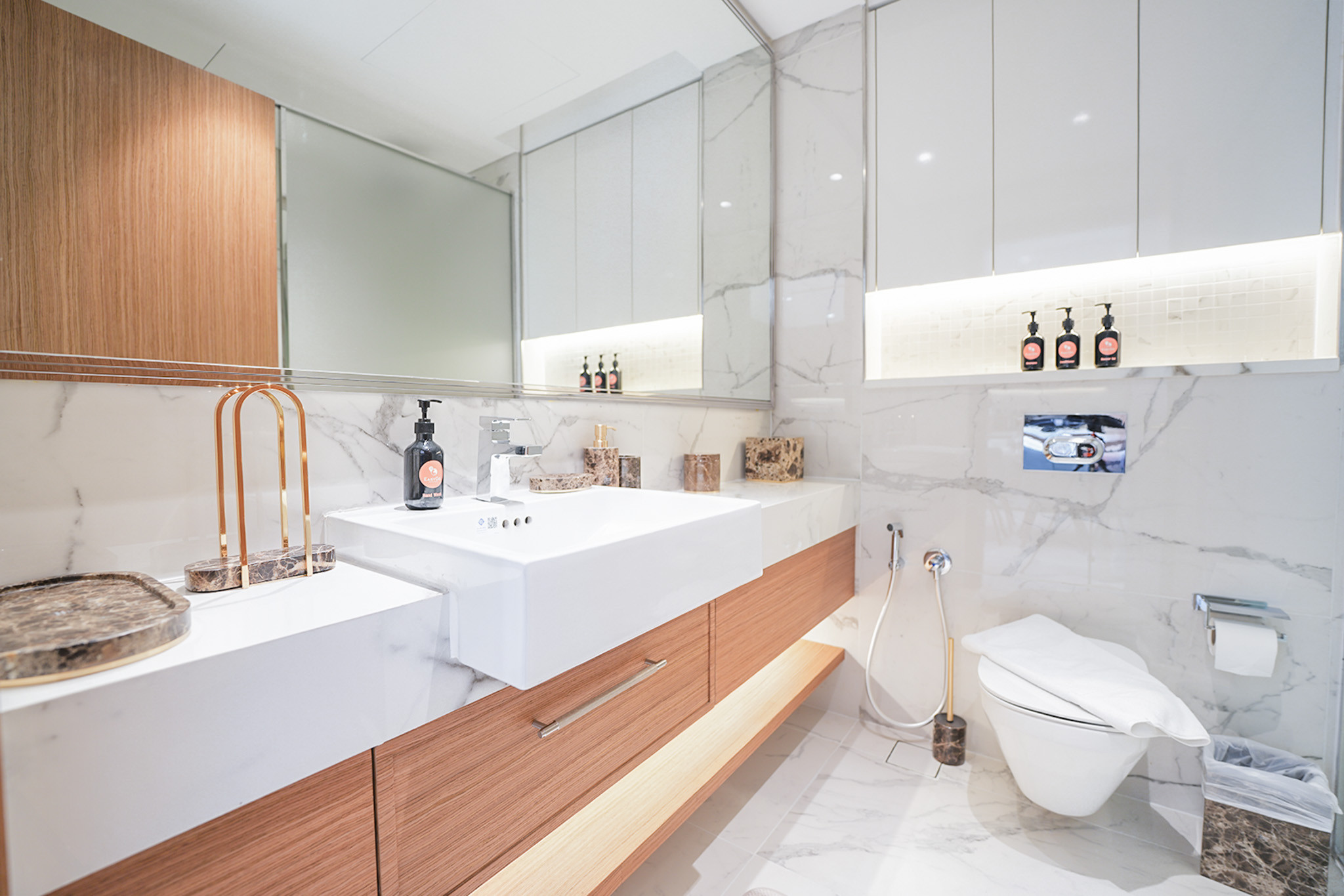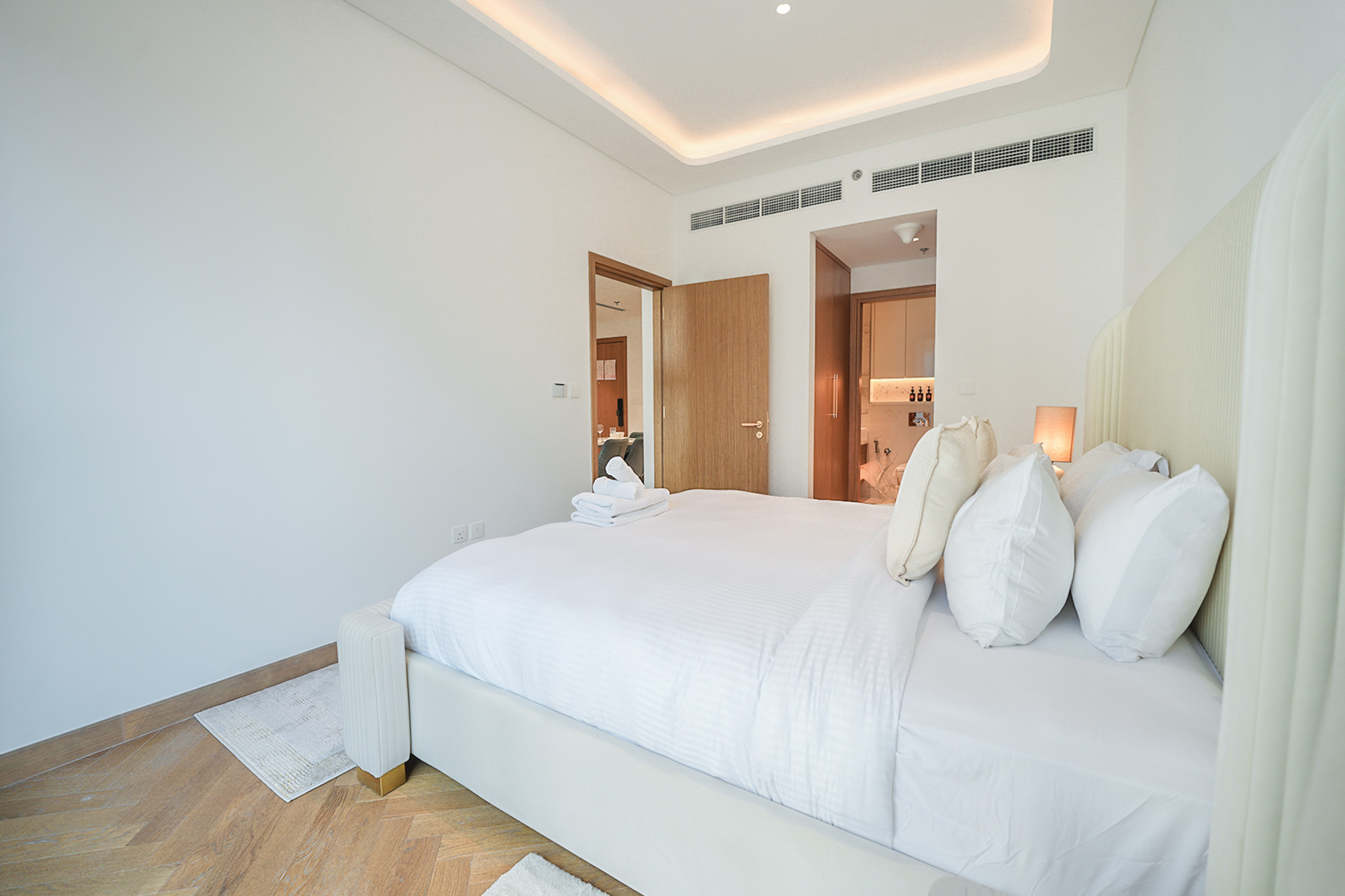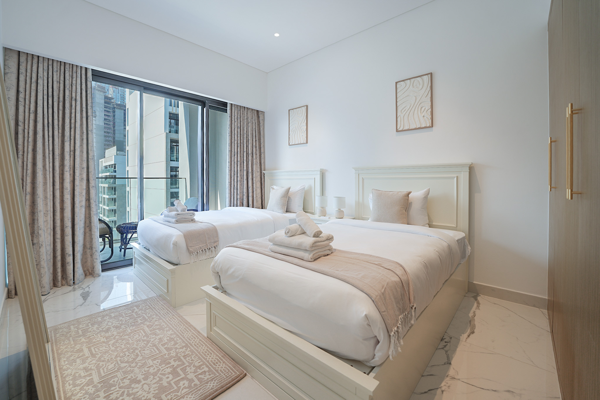 The apartment offers a serene master bedroom with a king-sized bed, en-suite bathroom, and calming décor, complemented by a second bedroom with twin beds and balcony access—ideal for families or groups. Contemporary bathrooms with marble finishes and high-quality fittings complete the home, ensuring both comfort and style throughout your stay.
