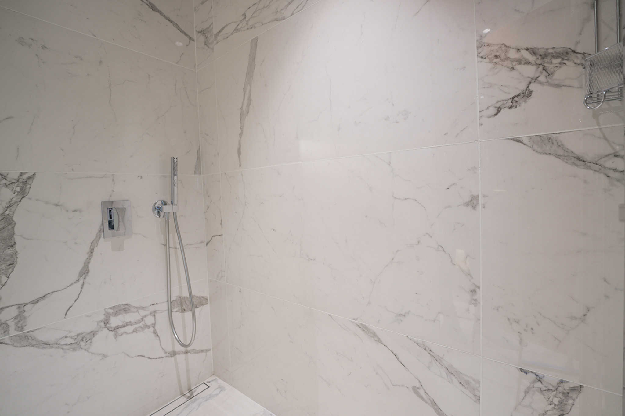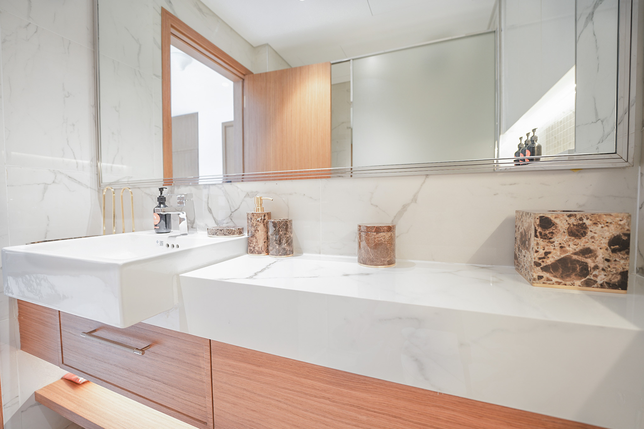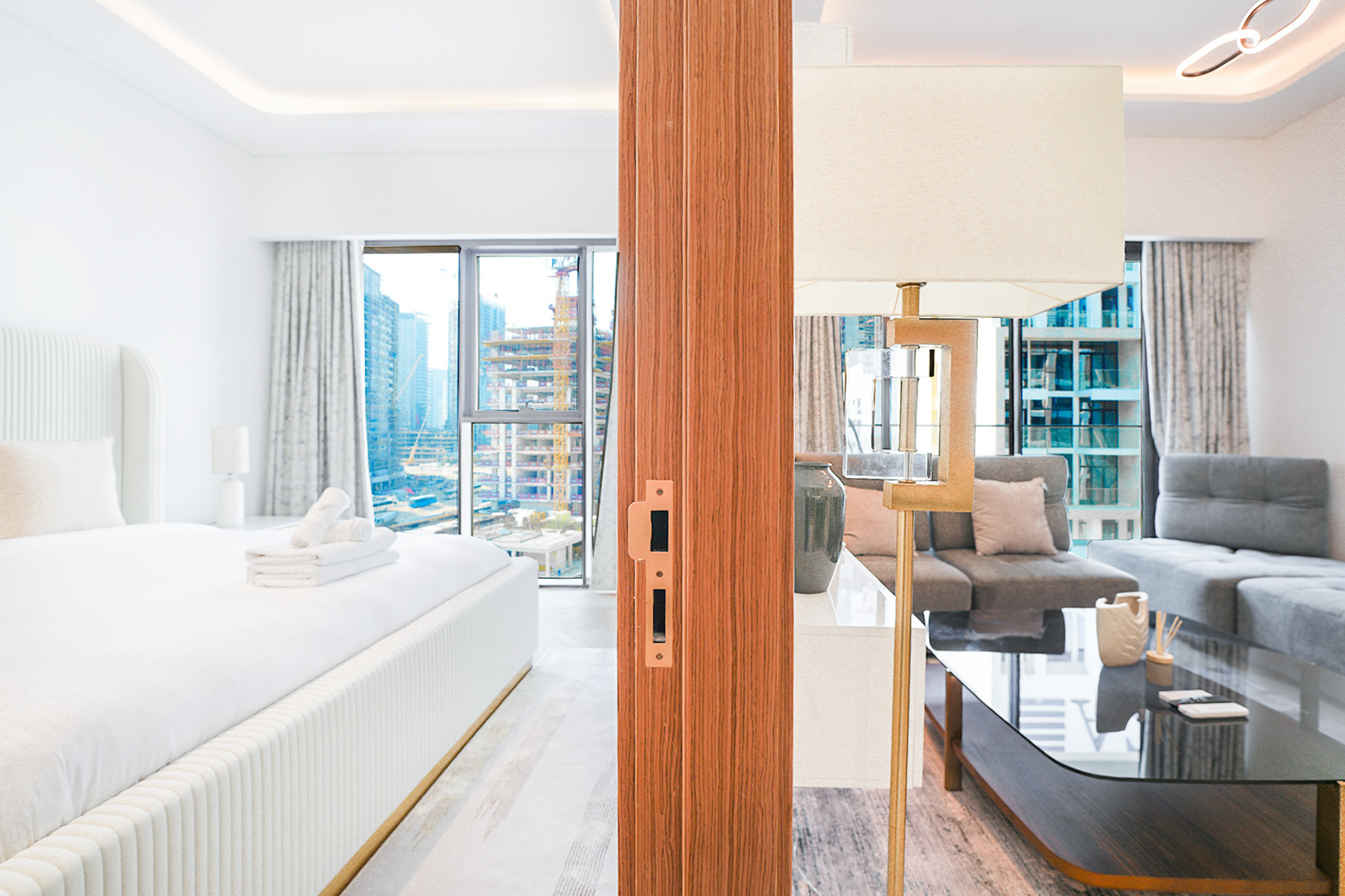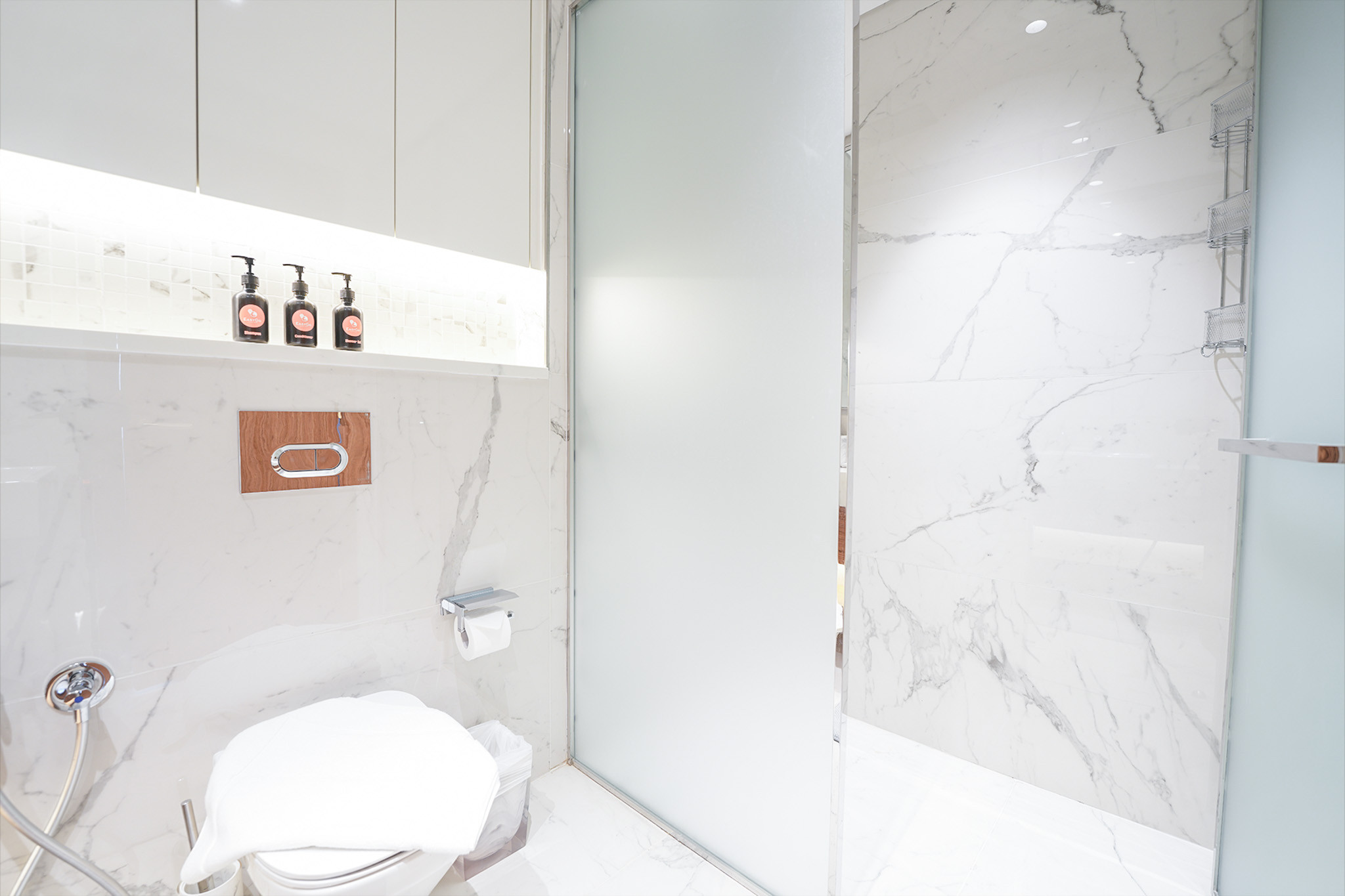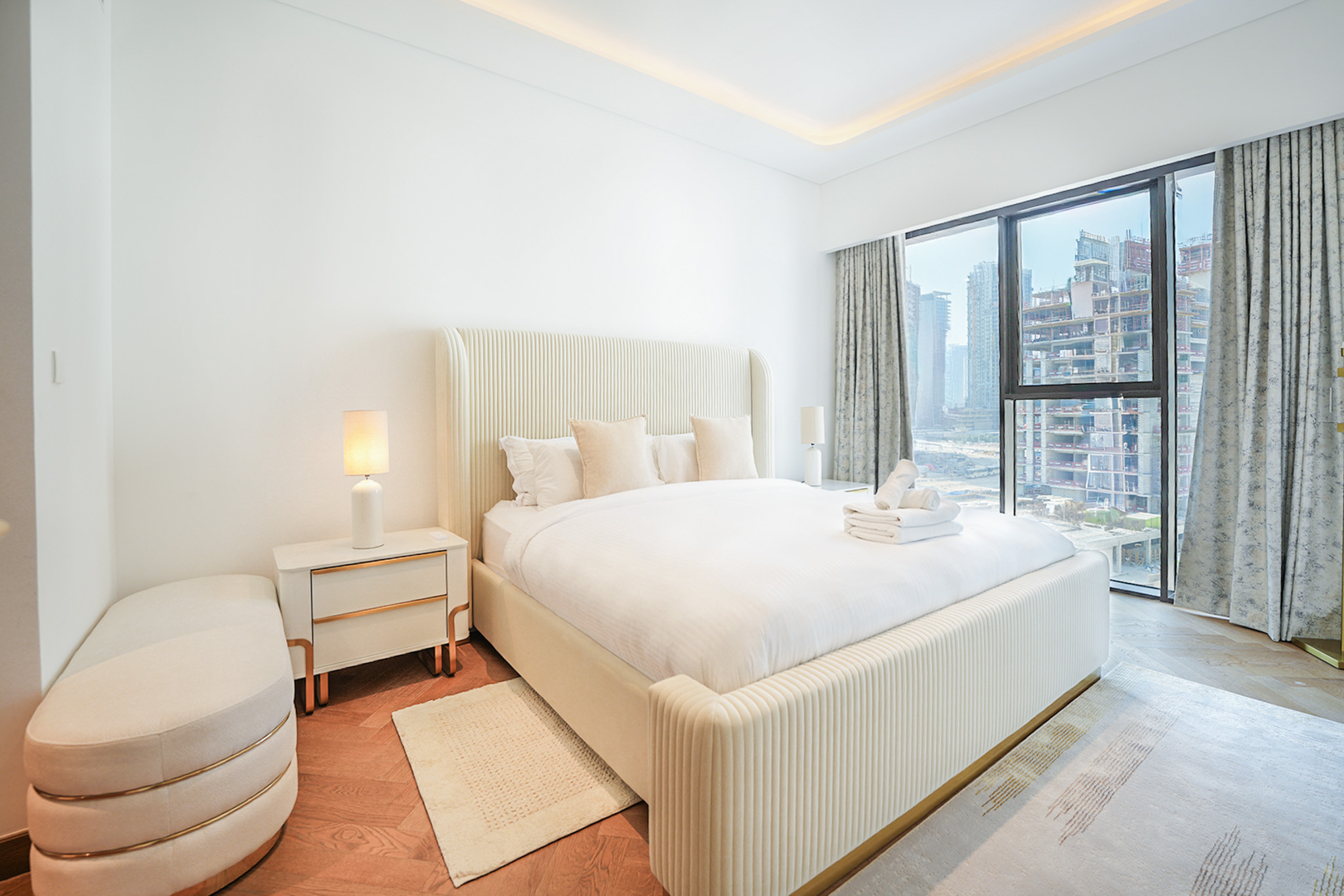 The apartment offers a serene master bedroom with a king-sized bed, en-suite bathroom, and calming décor, complemented by a second bedroom with twin beds and balcony access—ideal for families or groups. Contemporary bathrooms with marble finishes and high-quality fittings complete the home, ensuring both comfort and style throughout your stay.