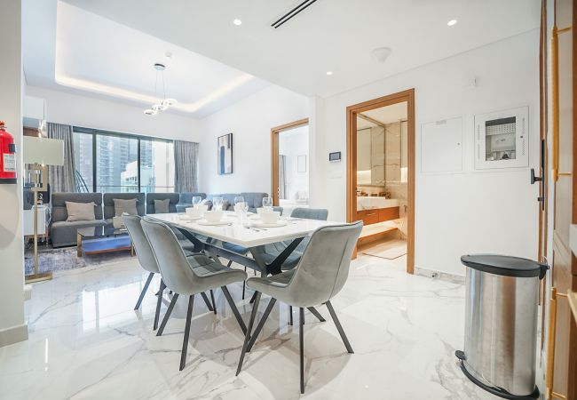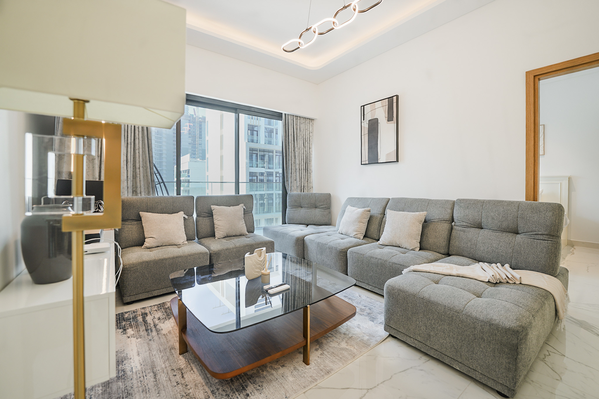 Experience the perfect blend of comfort, sophistication, and convenience in this beautifully furnished two-bedroom, two-bathroom apartment at Miraclz Tower by Danube. Thoughtfully designed to elevate your stay, the residence features a bright and spacious living room with elegant décor, a plush sofa, and a Smart TV. Floor-to-ceiling windows fill the space with natural light and offer vibrant city views, while the adjacent dining area provides the perfect setting for family meals or entertaining guests.