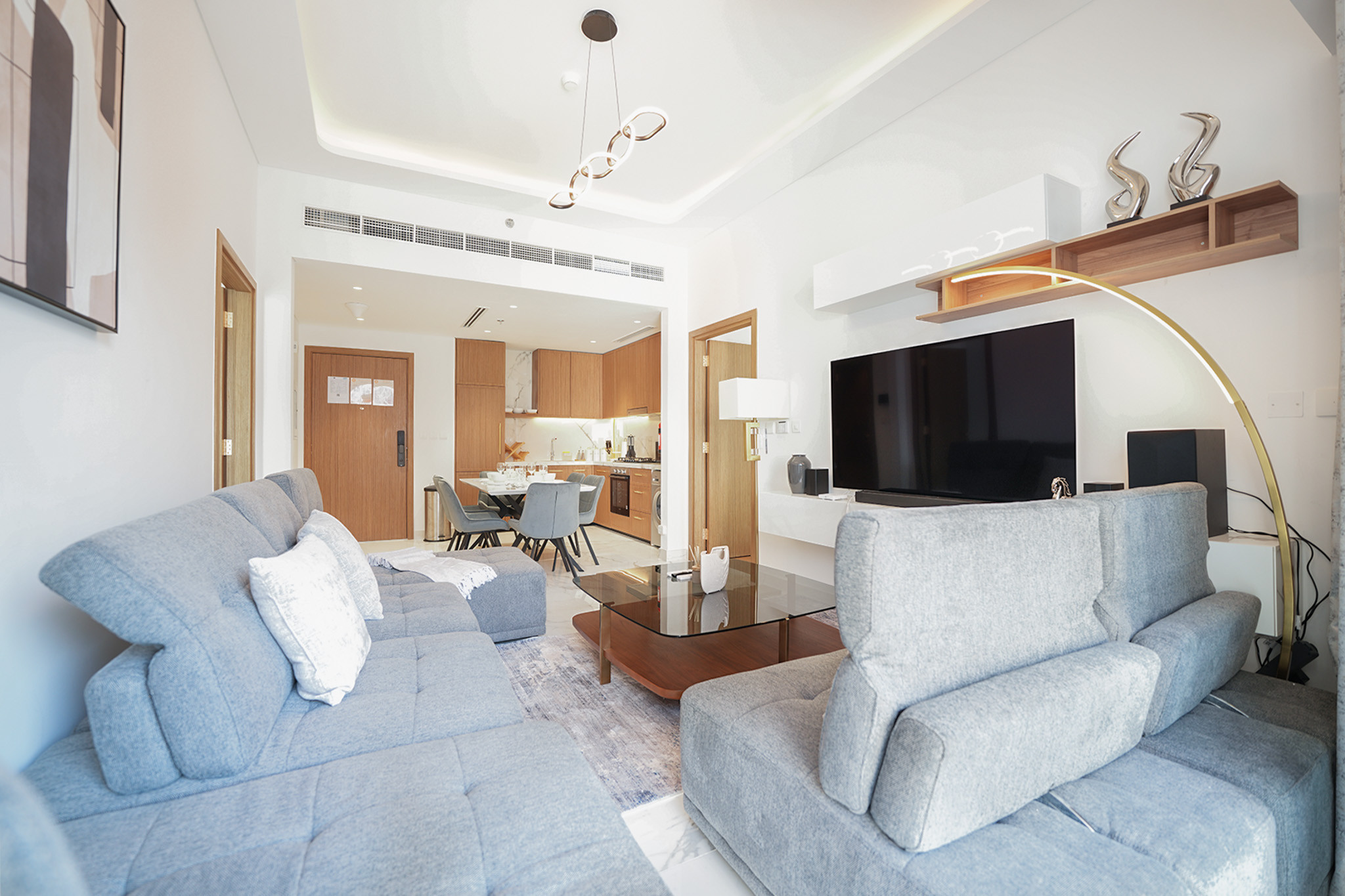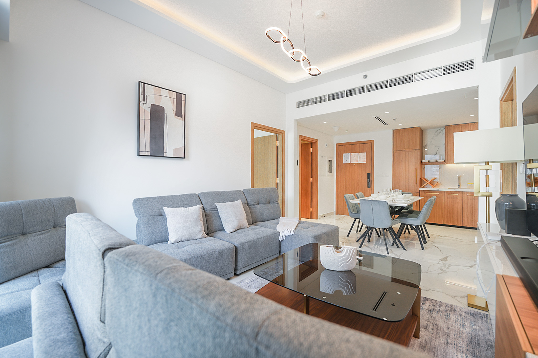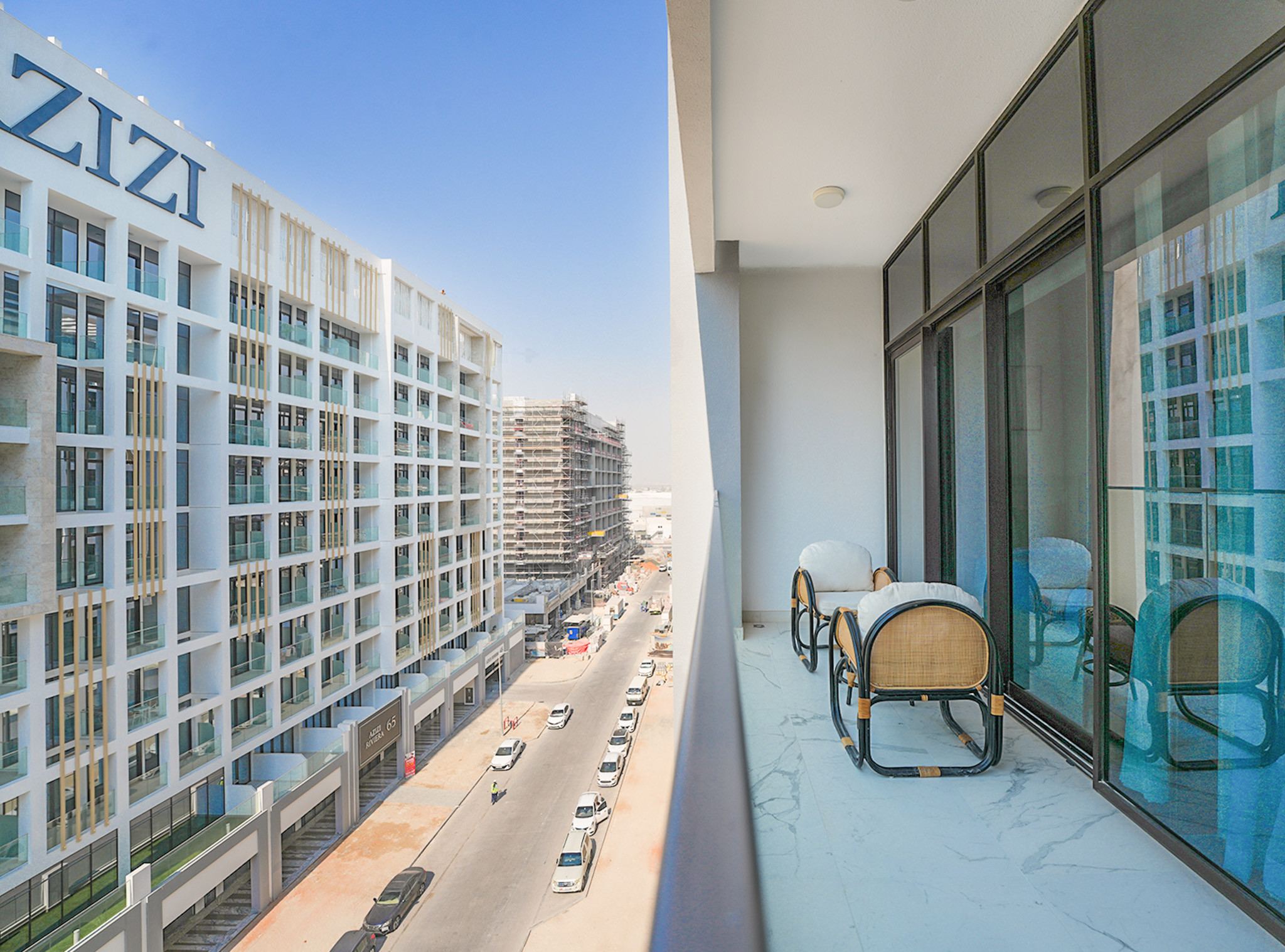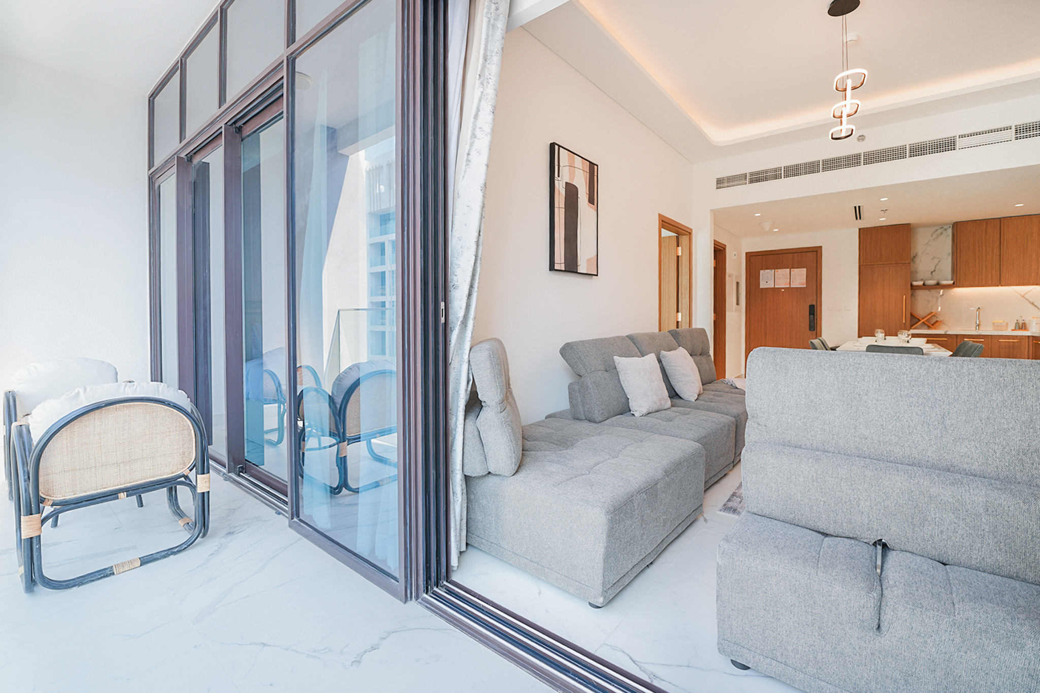 Experience refined living in this elegantly furnished 2-bedroom, 2-bathroom apartment at Azizi Riviera 67, located in the vibrant Meydan community of Dubai. The residence features an open-plan living and dining area with plush seating, a Smart TV, and floor-to-ceiling windows that open to private balconies with modern outdoor furniture and refreshing city views. A fully equipped kitchen with premium appliances and a full dining table set creates the perfect space for both everyday convenience.