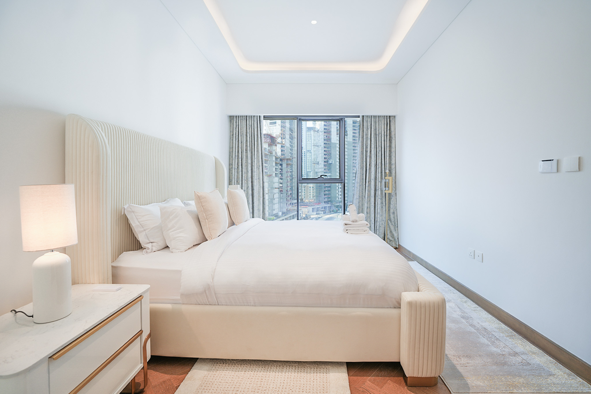 Both bedrooms offer a serene retreat, each fitted with a king-sized bed and connected to a modern en-suite bathroom— with a sleek walk-in shower and a full bathtub. The fully equipped kitchen is complete with high-quality appliances, catering to both short visits and extended stays. A private balcony furnished with seating adds the finishing touch, offering a tranquil space to relax and enjoy open views of the city.